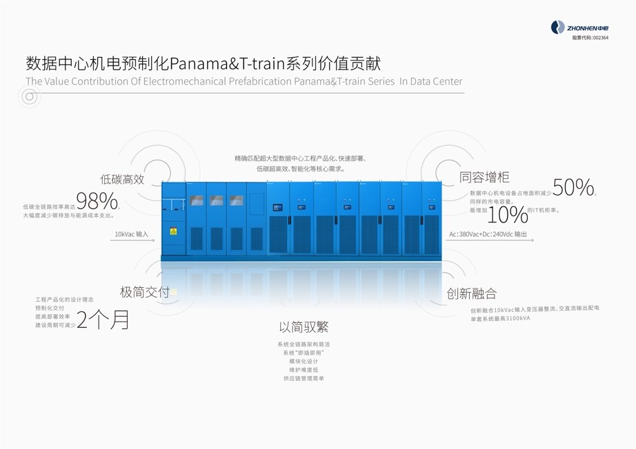 發(fā)展新能源和研制新型的能源供電架構(gòu)是推動(dòng)節(jié)能減排、低碳發(fā)展的重要路徑。Panama&T-train是中恒通過(guò)創(chuàng)新的磁路技術(shù)、電力電子技術(shù)和數(shù)字化技術(shù),研制出的融合10KV配電、新型變壓器、不間斷電源(HVDC)和智能輸配電等單元的智能一體化電源系統(tǒng)。