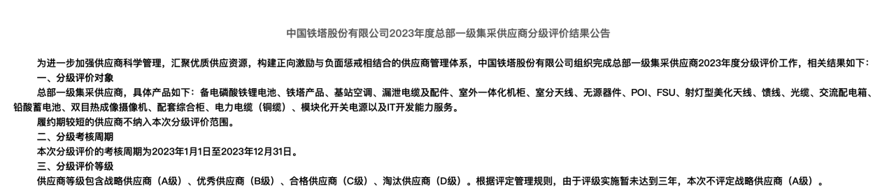 近日,中國鐵塔公布了2023年度總部一級集采供應商分級評價結果,中恒電氣的“模塊化開關電源”產品榮獲優秀供應商(B)評級。