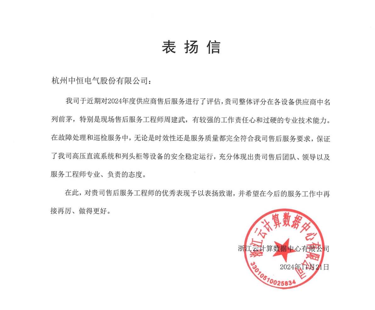 近日,中恒電氣收到了浙江云計算數(shù)據(jù)中心有限公司(以下簡稱“浙江云計算”)發(fā)來的一封表揚信,對我司在2024年度的售后服務(wù)及售后服務(wù)工程師表揚致謝。